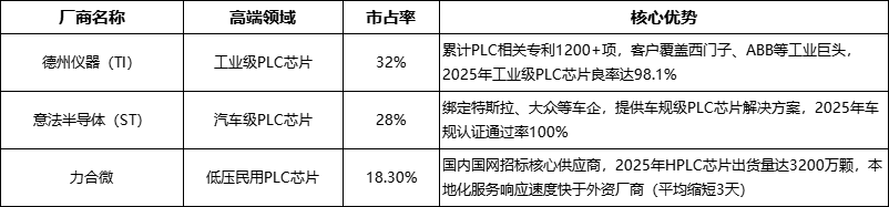 国际竞争格局呈现“外资主导高端、本土聚焦民用”的特征:德州仪器和意法半导体在工业级、汽车级PLC芯片领域市占率分别达32%和28%,核心优势在于专利壁垒和国际客户绑定;力合微则聚焦低压民用PLC芯片,市占率18.3%,优势在于本地化服务和国网招标资源。