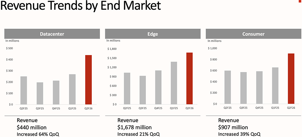 边缘计算业务收入为16.78亿美元(约合人民币117亿元),环比增长21%,需求“显著超过供应”,主要受AI应用带来的设备更新换代及PC和移动设备配置日益丰富等因素驱动。
