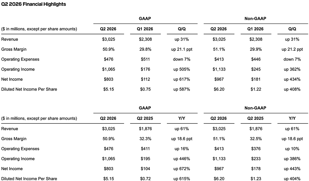 其第二季度营收为30.3亿美元,同比增长61%,环比增长31%;利润为8.03亿美元,同比增长672%;预测第三季度营收将在44亿至48亿美元之间,市场供应将比第二季度更加紧张。