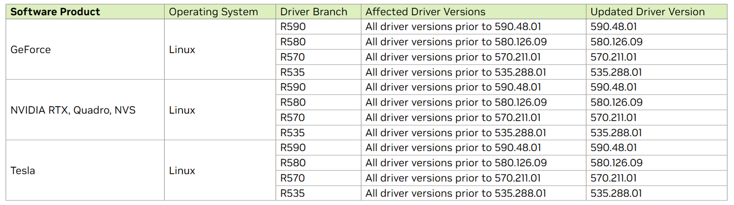 R590 分支用户需更新至 591.59,R580 分支需更新至 582.16,R570 分支需更新至 573.96,而 R535 分支则需更新至 539.64。只要当前驱动版本低于上述数值,设备即处于风险之中。