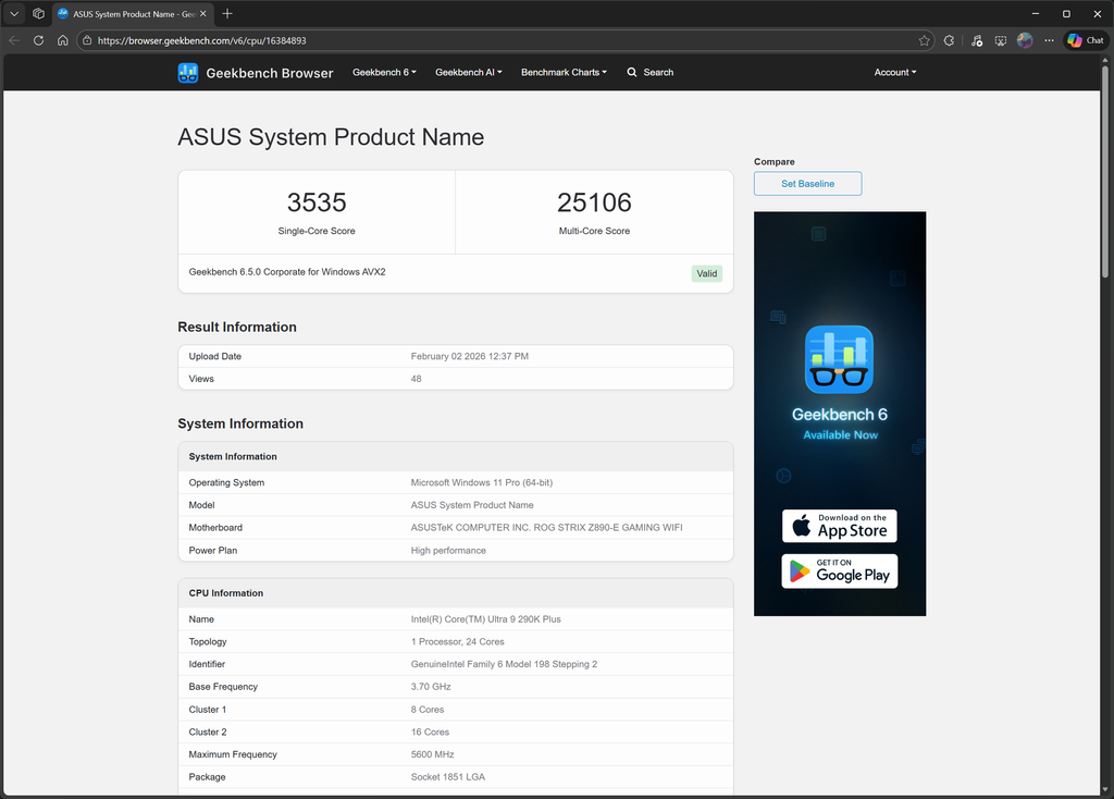 测试环境为配备64GB DDR5-6800内存的华硕ROG Strix Z890-E Gaming Wi-Fi主板。该芯片在单核测试中斩获3535分,较前代3200分提升约10.5%。与Geekbench处理器基准测试排行榜上的所有数据相比,290K Plus的这一分数实际上使其荣登榜首。