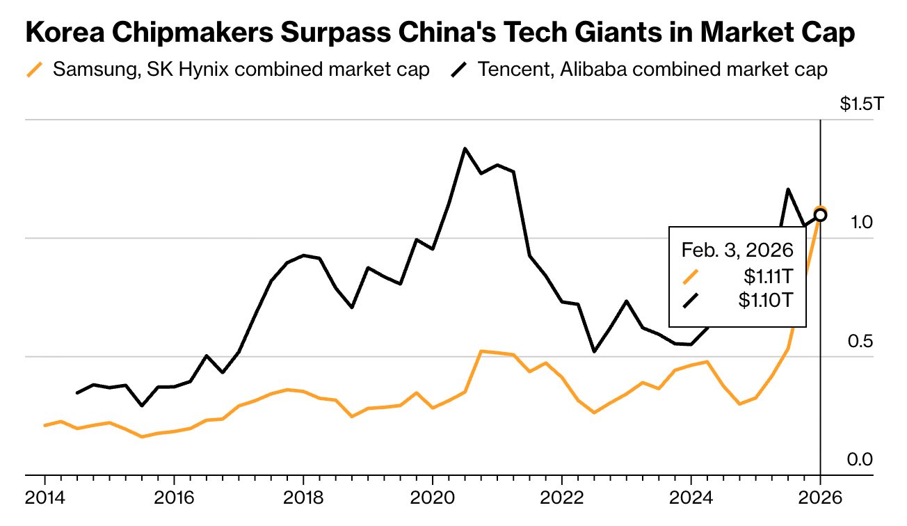凤凰网科技讯 北京时间2月3日,据彭博社报道,韩国两家最具价值公司的总市值在周二首次超越了两家中国科技巨头,凸显出全球AI热潮的演变正在重塑亚洲科技领域的投资格局。
