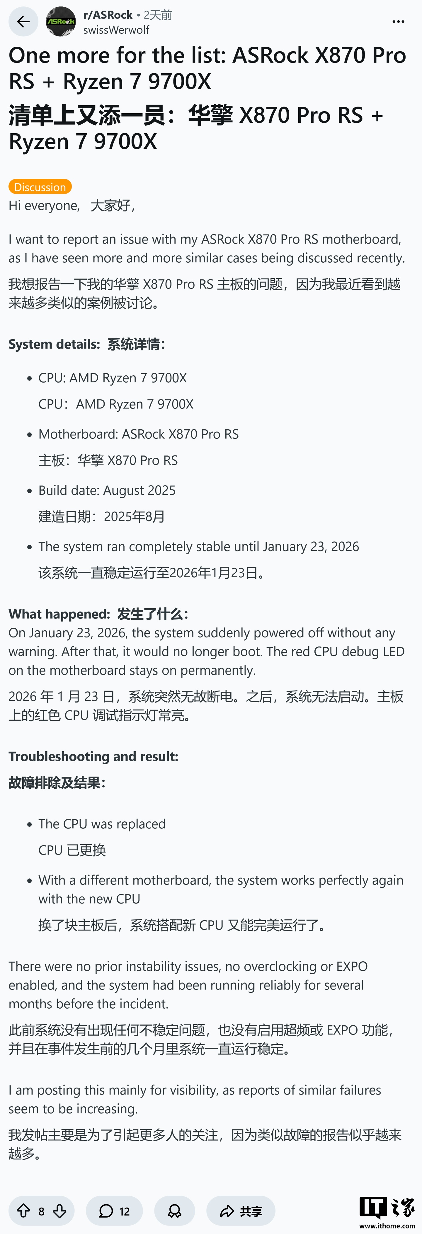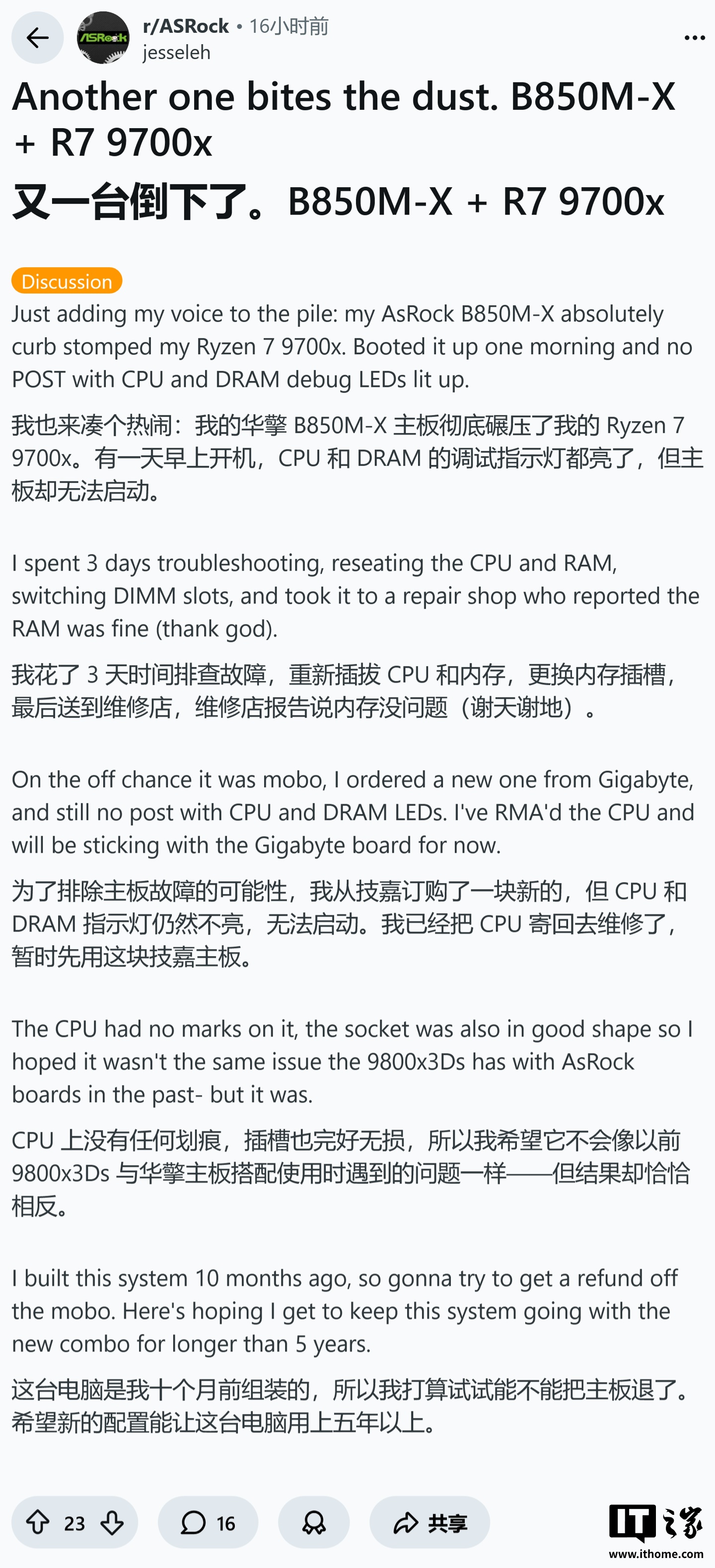 用户 u/RobotRollCall24 报告称,其使用的华擎 B850 Pro-A 主板即便已升级至最新的 4.03 版本 BIOS,依然导致了 Ryzen 9600X 彻底损坏,无法开机。