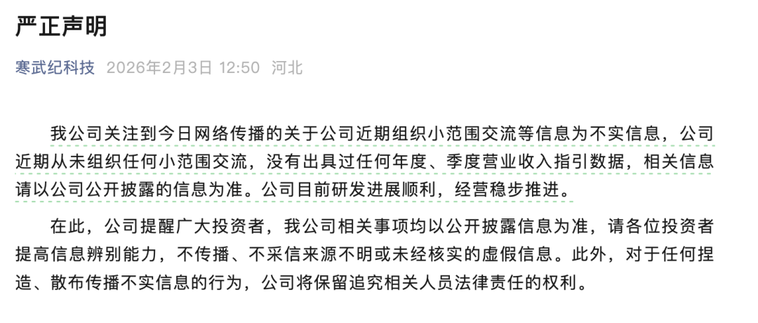 2月3日午间,寒武纪通过官方微信公众号发布严正声明:“公司近期从未组织任何小范围交流,没有出具过任何年度、季度营业收入指引数据。”