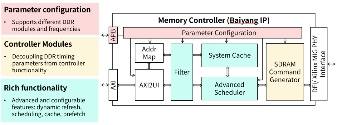 高级功能模块:集成了动态刷新、智能调度、缓存及预取等高级功能模块,显著提升了内存控制器的性能。