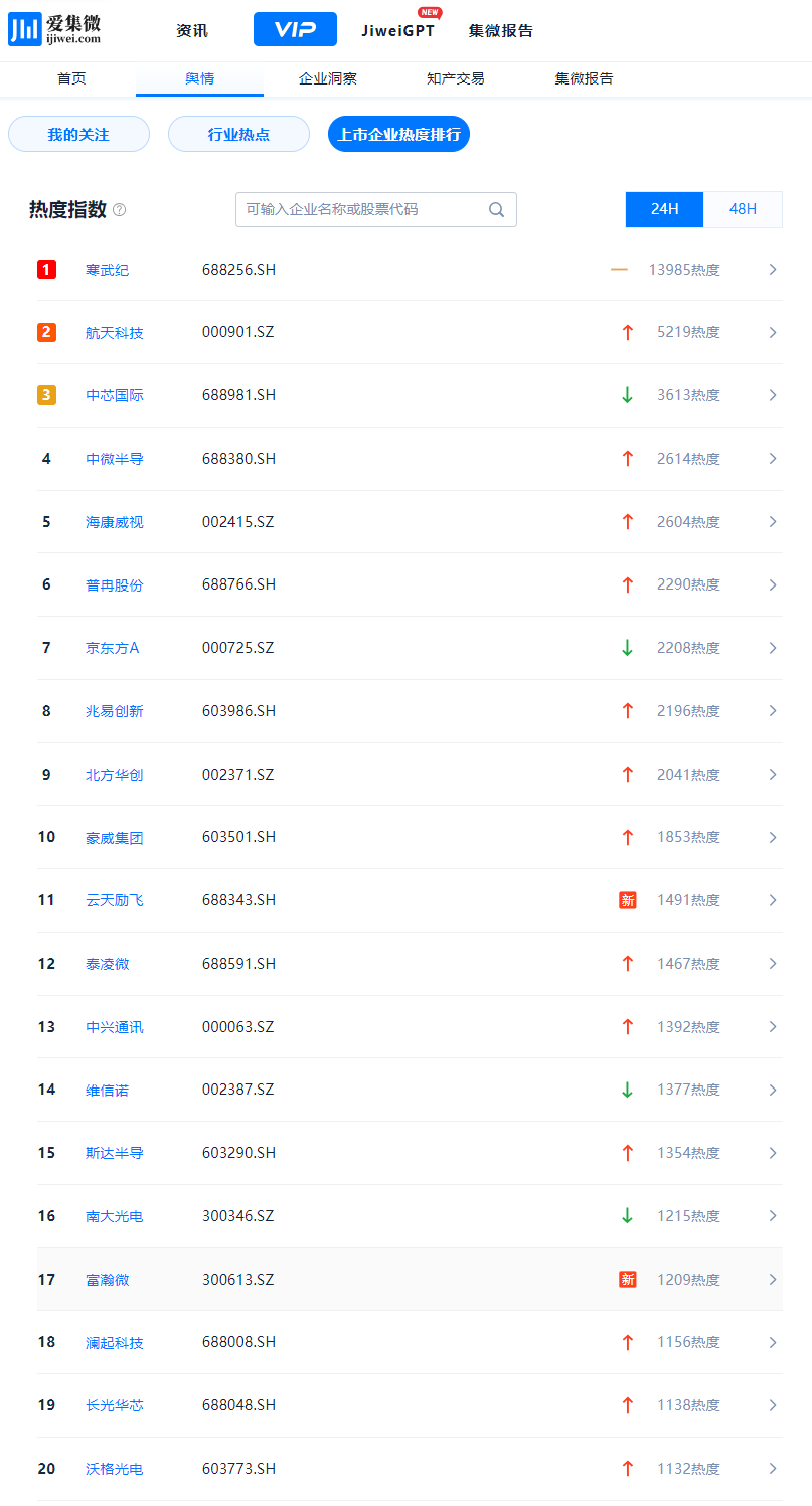 登录爱集微VIP频道,实时查看动态“上市企业热度排行”,穿透洞察每一个波动背后的驱动因素。