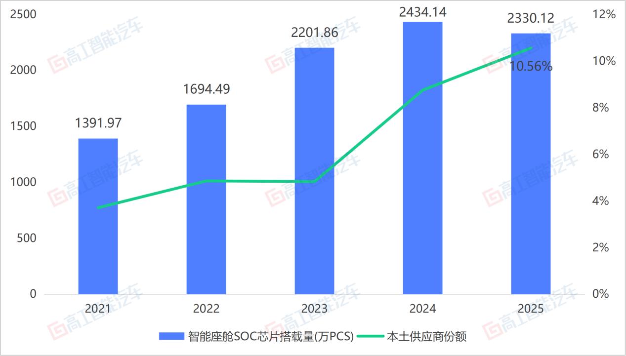 2021-2025年国产乘用车前装标配智能座舱SoC搭载量及本土供应商份额