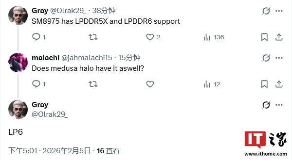 IT之家 2 月 5 日消息,消息人士 Gray (@Olrak29_) 刚刚在 X 平台表示,AMD 基于 "Zen 6" 微架构的下一代锐龙 AI Max 平台 —— "Medusa Halo" 处理器将支持 LPDDR6 内存。