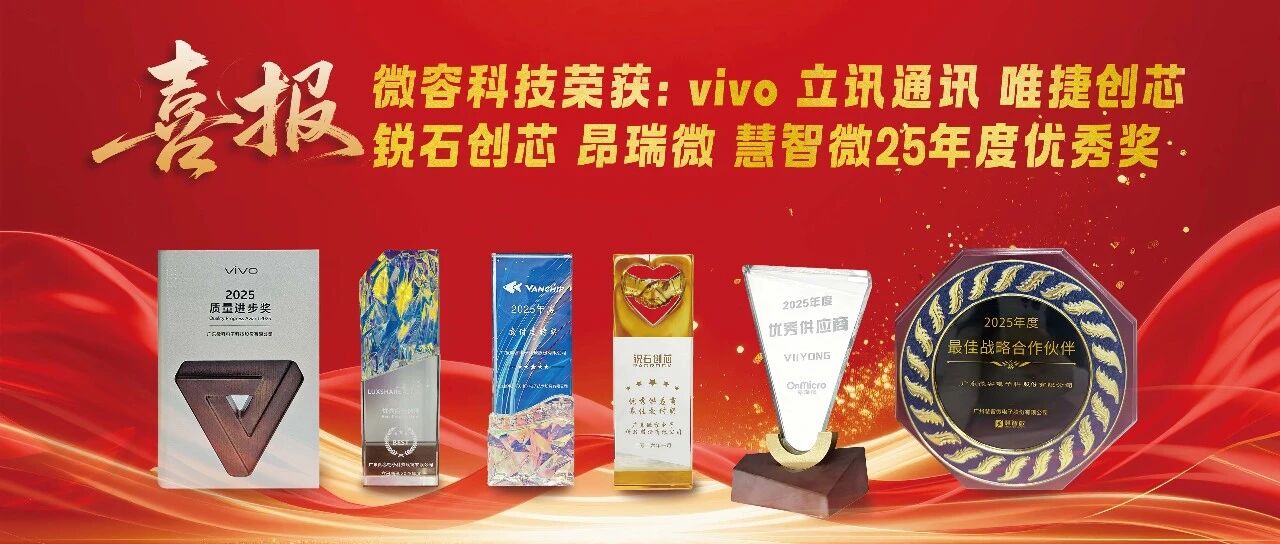 在质量领域,微容科技在2025年荣获vivo颁发的“质量进步奖”。该奖项旨在鼓励和认可在产品质量与生产流程中实现显著提升的供应商。vivo对微容科技在质量管理方面的持续进步给予了高度认可,尤其在过往合作中始终保持出色的产品质量记录。微容一直致力于提升产品品质,不断优化生产工艺,在质量体系管理、过程控制与产品检验等方面实施严格管控,以全面满足客户的需求。