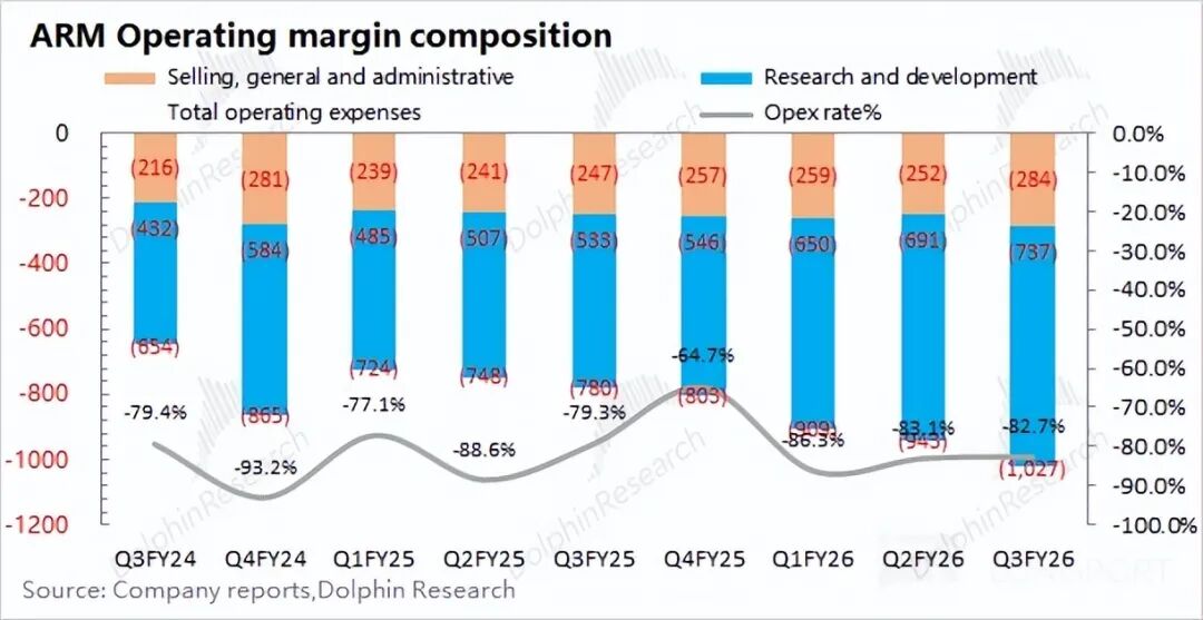 ARM 本季度业绩还行,收入端和毛利率基本达到了市场预期,许可证业务和版税业务的增速都在 20% 以上。公司持续加大研发投入,本季度研发费用率维持在 60% 左右,导致公司最终利润有所回落。