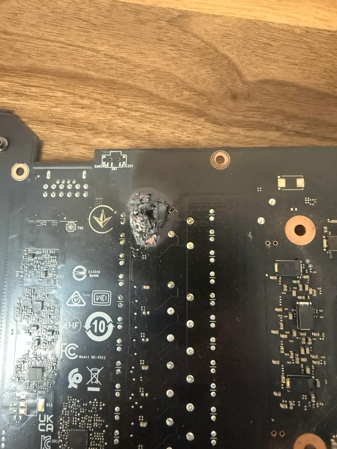 该用户在事后检查该显卡。照片显示,损毁区域位于散热器下方,紧邻 16Pin 供电接口。