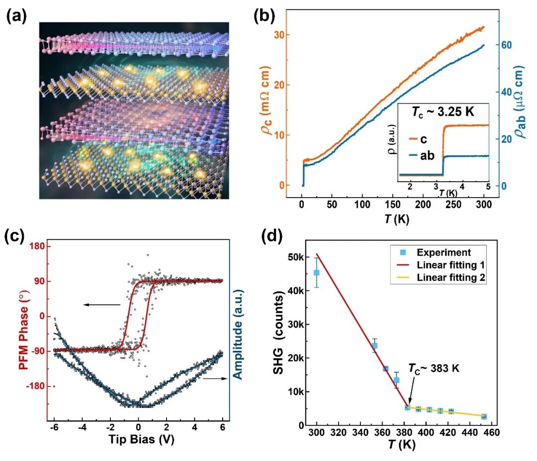 这种新材料在室温下能够保持优异性能:铁电转变温度高达383K(约110℃),远超室温;导电性出色,载流子浓度超过1021cm-3,表现出3.25K的超导特性。