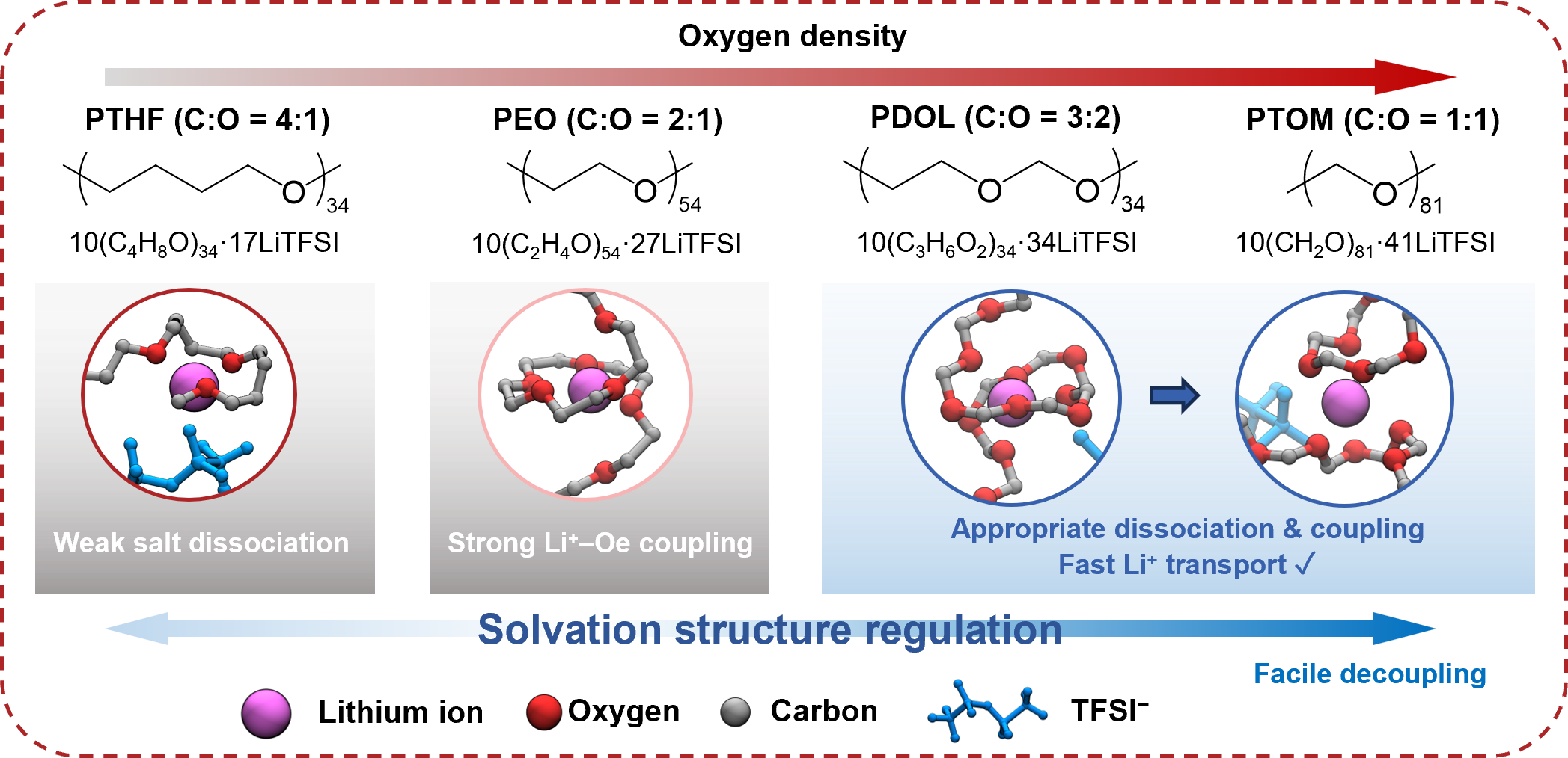 近日,深圳国际研究生院副教授侯廷政团队与合作者揭示了醚类聚合物固态电解质中氧官能团密度对锂离子输运的本质影响。研究团队从理论和实验两方面,研究具有不同醚氧官能团密度的聚合物电解质,发现在低氧密度下锂离子呈现具有锂键(lithium bond)化学特征的松散氧配位溶剂化结构;在高氧密度下锂离子则呈现出一种独特的非连续配位(discontinuous coordination, DC)溶剂化结构,可显著促进离子跨聚合物链段迁移,有效提升锂离子传输效率。该研究为设计高离子电导率聚合物电解质提供了系统性理论框架和全新策略。
