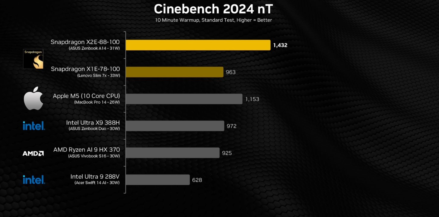 骁龙 X2 Elite - 1432(比 M5 快 24.2%,比骁龙 X Elite 快 48.7%)