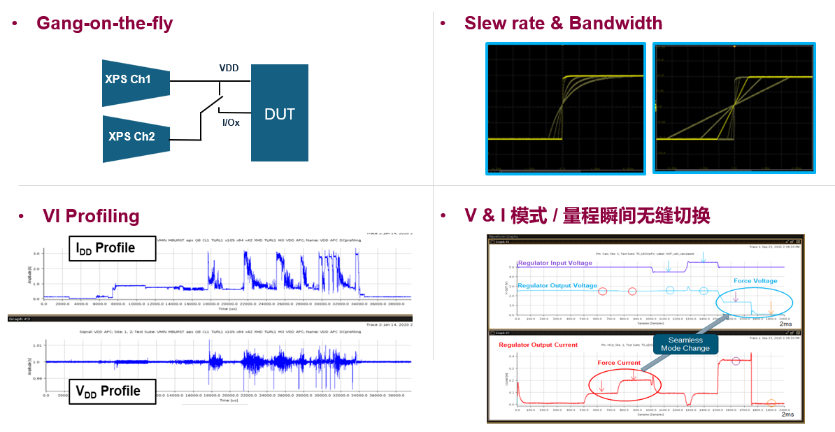 · 软硬件协同:Xtreme Regulation™具备Gang-on-the-fly、可编程的斜率及带宽、电压电流的Profiling和无缝切换,为充电管理芯片提供高效、灵活且精准的测试解决方案;同时Fast Current Clamp具有Per-Channel 极速电流钳位功能为负载板器件、探针针尖和测试座提供 <2us的零损伤硬件保护。
