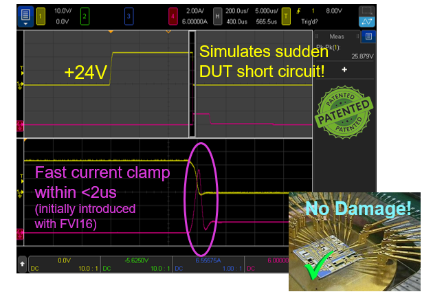 Fast Current Clamp是爱德万测试的专利技术,具有Per-Channel 极速电流钳位功能为负载板器件、探针针尖和测试底座提供<2us的零损伤硬件保护, 具备实时监测及快速有效应对异常电压,电流的保护机制。