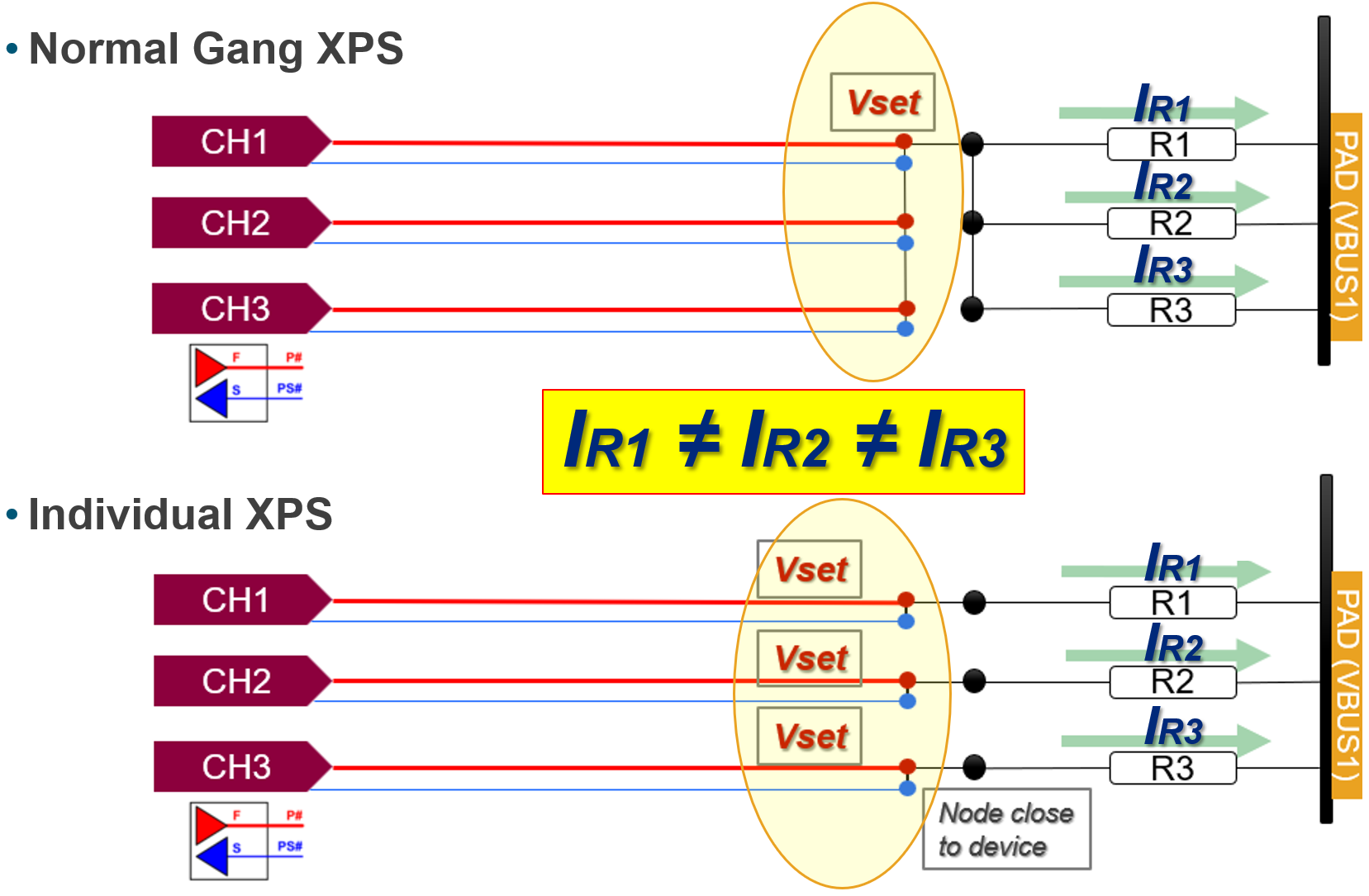 本方案通过“Independent FORCE Ganging”架构,将每个XPS128+HV的FORCE线独立连接至芯片管脚(引脚),同时将3个SENSE线短接至芯片近端(即Vset)的硬件连接方案,可实现:
