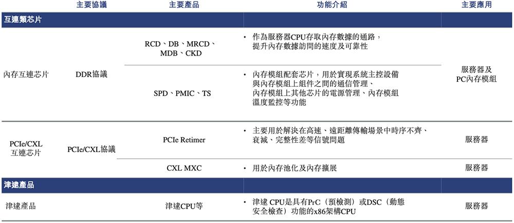 其互连类芯片主要包括内存接口芯片、内存模组配套芯片、PCIe/CXL互连芯片及时钟芯片;津逮产品主要由津逮CPU组成,津逮CPU是一个具有PrC(预检查)或DSC(动态安全检查)功能的x86处理器系列。
