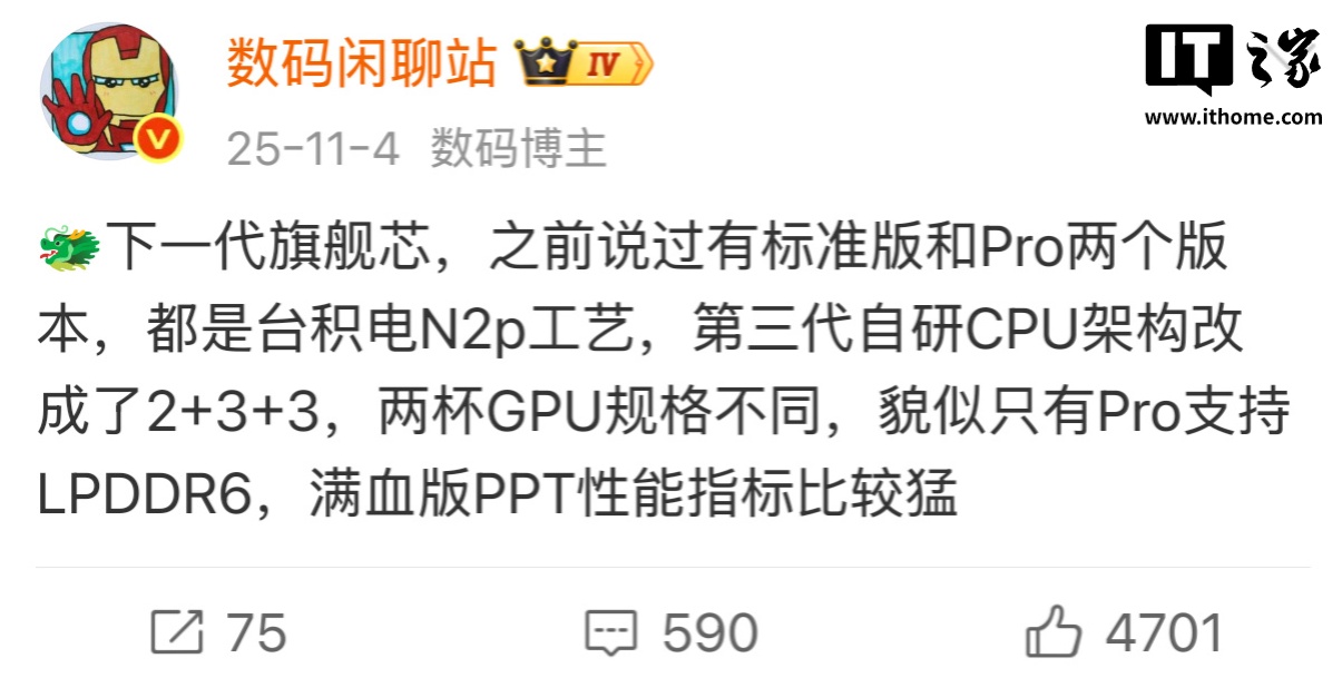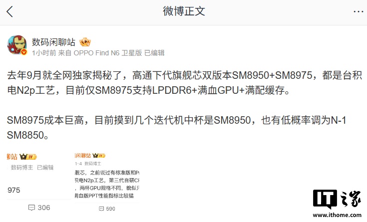 IT之家 2 月 9 日消息,博主 @数码闲聊站 今日爆料称,高通下代旗舰芯双版本 SM8950+SM8975,都是台积电 N2p 工艺,目前仅 SM8975 支持 LPDDR6+ 满血 GPU+ 满配缓存。