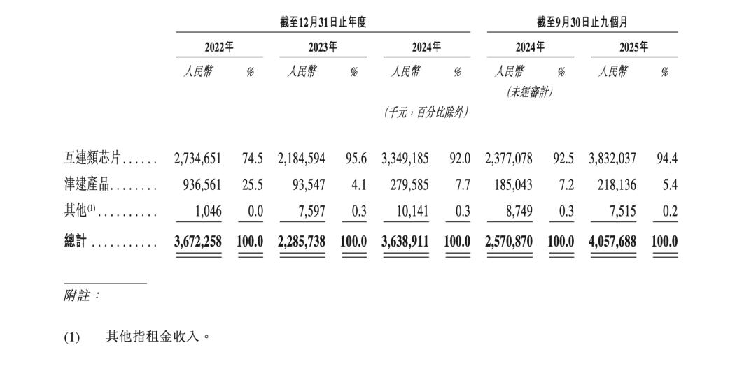招股书显示,2022-2024年及2025年前三季度(下称:报告期),澜起科技来自互连类芯片的收入分别约27.35亿、21.85亿、33.49亿、38.32亿元,占营收的比例分别为74.5%、95.6%、92.0%、94.4%;来自津逮产品的收入分别约9.37亿、9354.7万、2.80亿、2.18亿元,占比分别为25.5%、4.1%、7.7%、5.4%。