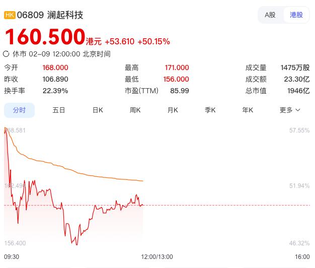 今日开盘,澜起科技H股较发行价106.89港元大涨57.17%报168港元,盘中最高触及171港元。截至午间休市,澜起科技涨50.15%报160.5港元,总市值1946亿港元。