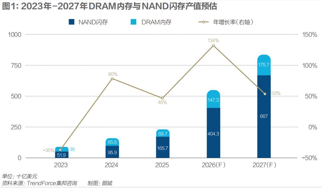 不仅DRAM内存涨,2025年四季度NAND闪存也跟着大涨,TrendForce集邦咨询预计2026年一季度NAND闪存将增长55%-60%,且涨势会持续到2026年年底,推动NAND产值增长至1473亿美元,年增长率达112%。