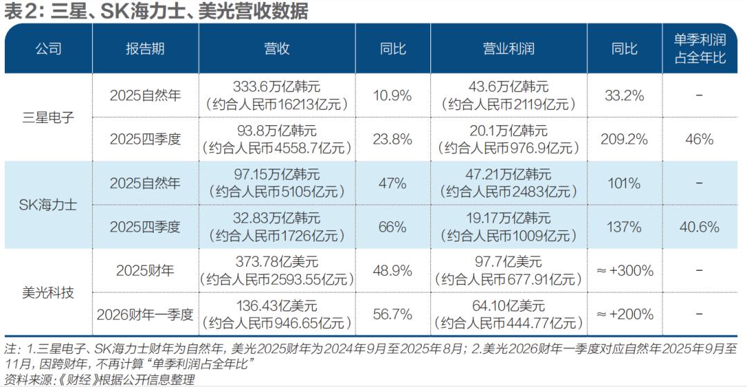 例如,三星2025年全年营收333.6万亿韩元、营业利润43.6万亿韩元、净利润45.2万亿韩元,同比分别增长10.9%、33.2%、31.2%。其四季度业绩表现尤为亮眼,营收93.8万亿韩元,营业利润20.1万亿韩元,同比增长209.2%,四季度营业利润占全年营业利润的46.0%。