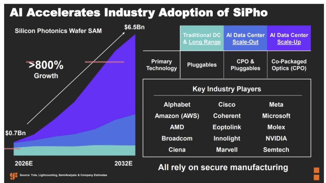 数据中心人工智能正推动硅光子代工厂实现迅猛增长:从2026年到2032年,短短六年间增长八倍。目前,横向扩展是主要驱动力。几年后,纵向扩展将成为最大驱动力,因为数据中心纵向扩展涉及的环节远多于横向扩展。