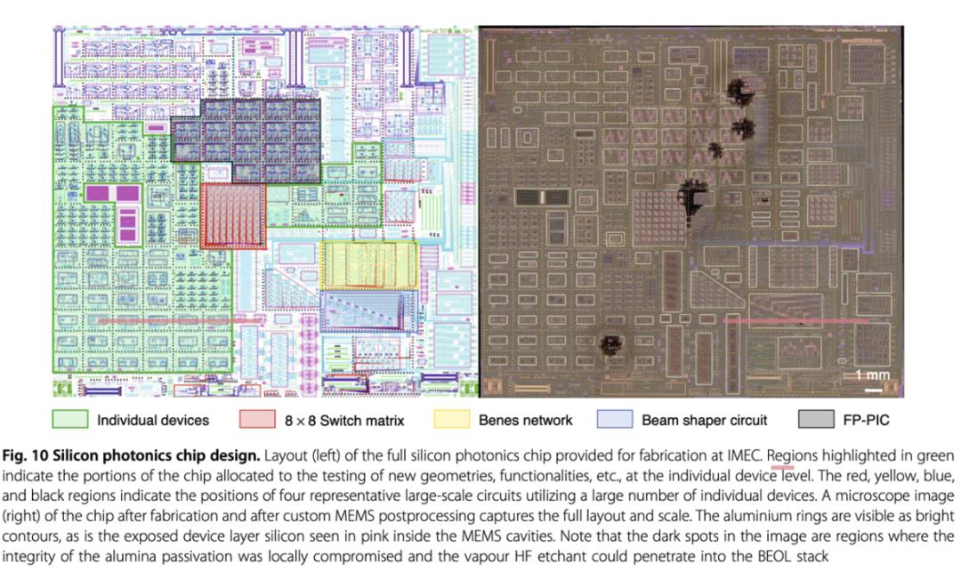 图 12:硅光子芯片的示意图和芯片照片