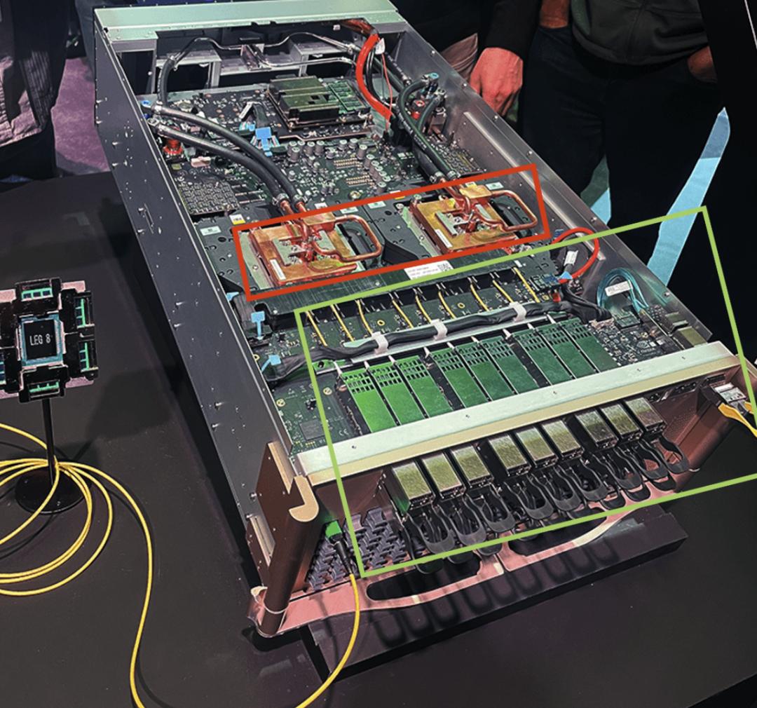 交换机是两个芯片(上图中红色方框内),上方覆盖着液冷外壳。从顶部伸出的四根粗黑电缆是液冷进出线。可插拔激光器(上图中绿色方框内)位于图片底部盒子的顶部,用于提供信号载波。共有9个激光器,每个盒子可能包含8个激光器。可以看到9根黄色电缆从激光器连接到交换机芯片。激光器采用可插拔设计是因为它们的故障率较高,这样在发生故障时可以轻松更换,而无需更换整个交换机。左下角仅连接了一根输入光纤——即黄色电缆。可以看到还有许多其他光纤连接器。从I/O面板到芯片的光纤连接必须位于我们看不到的下方。