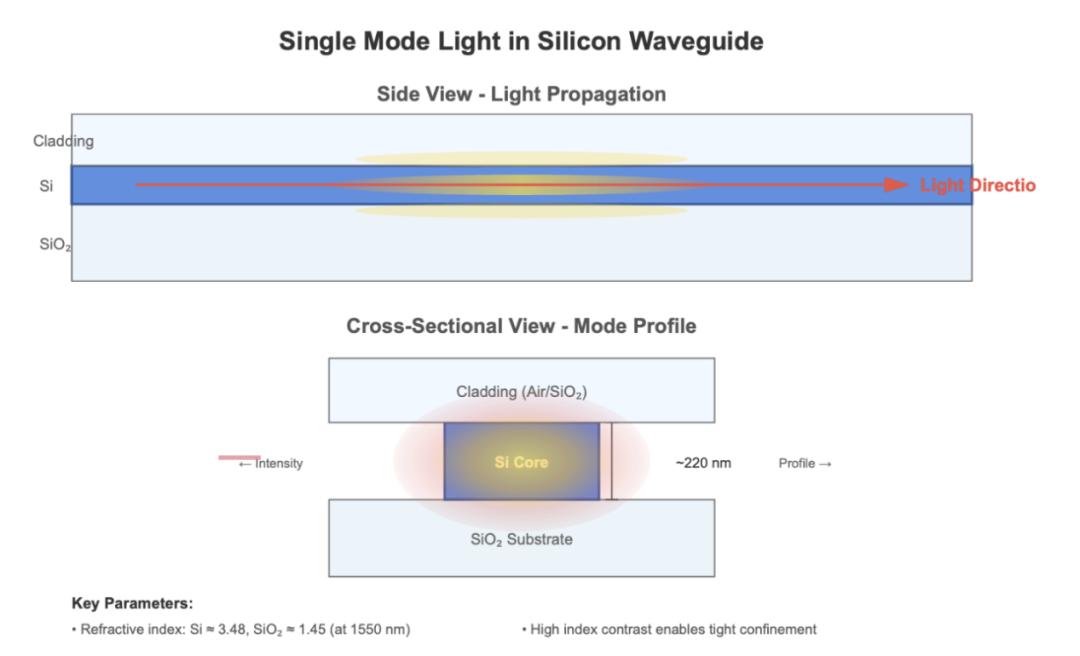 硅光子器件采用 200 毫米和 300 毫米晶圆制造,工艺精度可达 65 纳米。所用晶圆为 SOI 结构,并带有至少 1 微米厚的埋氧层(BOX:SiO2),用于光隔离。如下图所示,这是因为在硅(或氮化硅)波导中传输的单模光主要在硅波导芯内传播,但部分光场会“泄漏”到上方、侧面和下方的相邻材料中。因此,这些层必须足够厚,以防止光传播到其他有源区域。