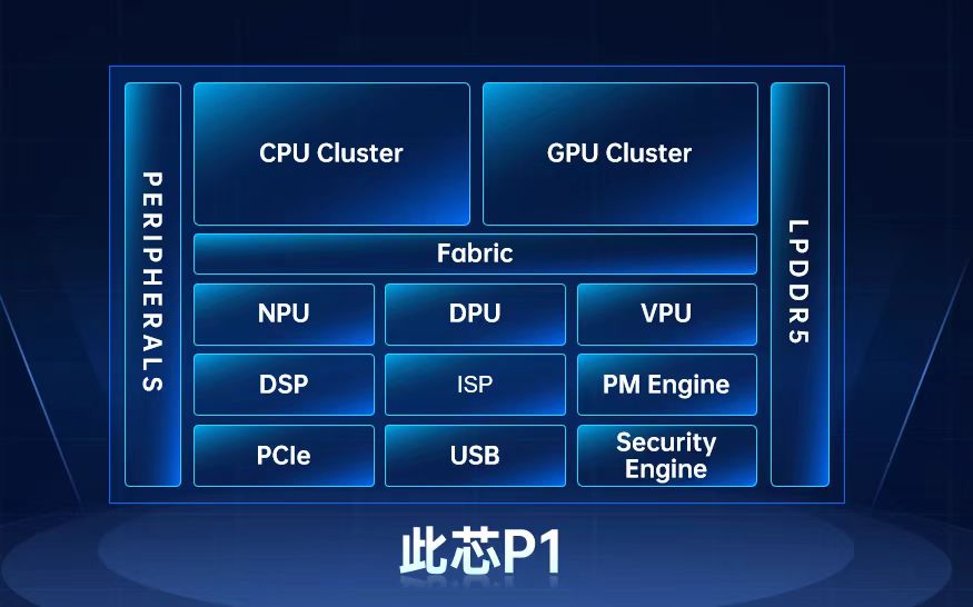 P1 SoC采用6nm先进制程,基于ARM v9.2架构,集成“8大核+4小核”异构CPU、高性能GPU与45 TOPS算力的NPU,对标国际主流产品,性能超越海外龙头主力产品。