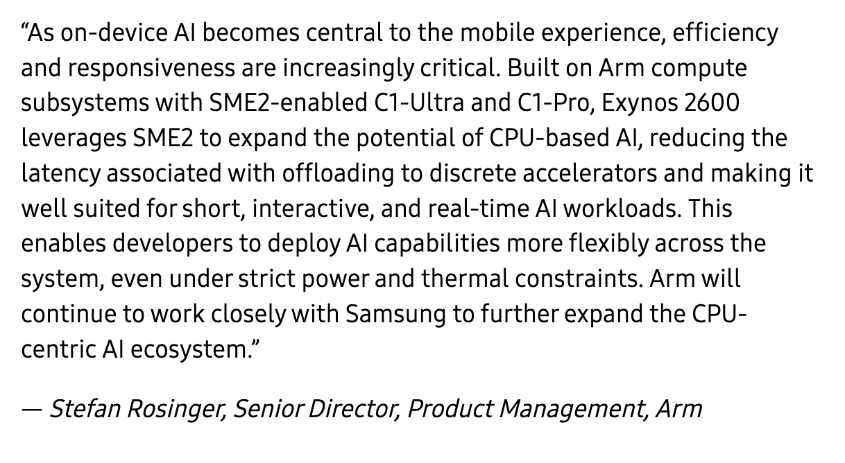 值得注意的是,三星官方在前天发布的新闻稿中提到了 C1-Ultra 和 C1-Pro 核心,意味着 Exynos 2600 很可能具备这两种核心。