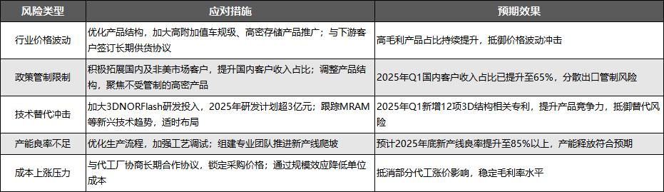 一是行业价格波动风险。2025年3月全球存储芯片市场价格出现波动,NORFlash均价环比下降2%,主要因美光、华邦等国际厂商调整产能释放节奏,短期内可能压缩公司利润空间;若行业产能持续扩张,价格战可能加剧,进一步影响毛利率。
