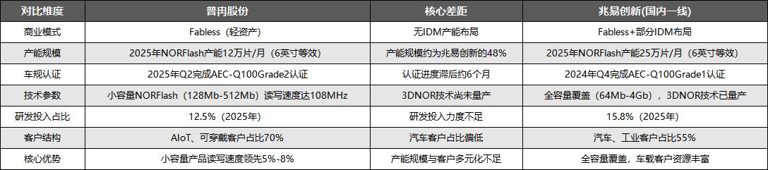 国内市场则呈现分层竞争态势,一线厂商(如兆易创新)引领行业发展,二线厂商(如普冉股份)快速跟进。一线厂商在产能规模、车规认证进度上具备优势;普冉股份则依托Fabless模式的灵活性和技术积累,在小容量NORFlash领域具备明显的差异化优势,但在多方面与一线厂商存在差距,具体对比如下: