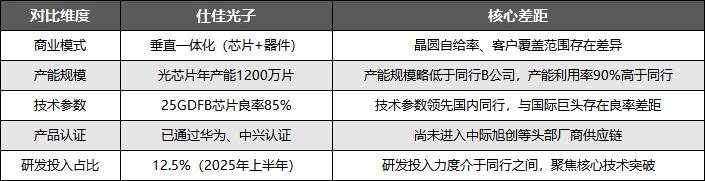 国内市场则呈现龙头引领的竞争态势,仕佳光子作为一线龙头企业,依托双技术平台和垂直一体化模式形成差异化优势,但在高端市场仍与国际巨头存在差距,与国内同行对比情况如下: