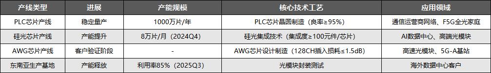 产能布局方面,公司采用“现有成熟产线+高端产线扩张+海外基地布局”的多维度布局策略,既巩固了PLC分路器等传统业务的基本盘,又成功卡位硅光芯片、1.6T光模块等高增长领域,产能规划与行业需求趋势高度契合,具体产线详情如下: