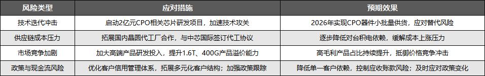 一是技术迭代冲击风险。CPO技术预计2026年在AI数据中心的渗透率将达到15%,若技术路线加速成熟,可能对传统硅光模块形成替代压力;公司目前CPO相关产品仍处于研发初期,尚未形成规模化产能,技术迭代响应速度将直接影响市场份额。