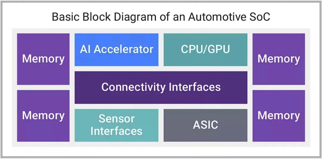 汽车 SoC 的基本框图直观地展示了各个组件及其互连关系。主要组件通常包括: