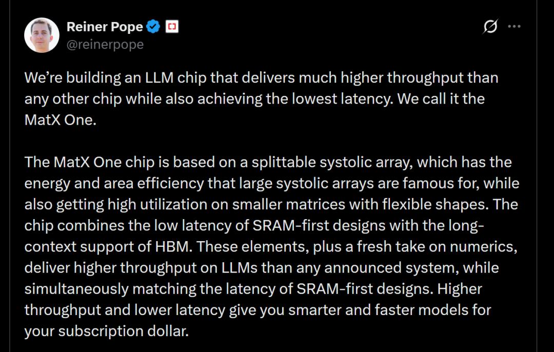 而且不止说说而已,据MatX创始人透露,他们目前正在打造一款“LLM专用芯片”MatX One: