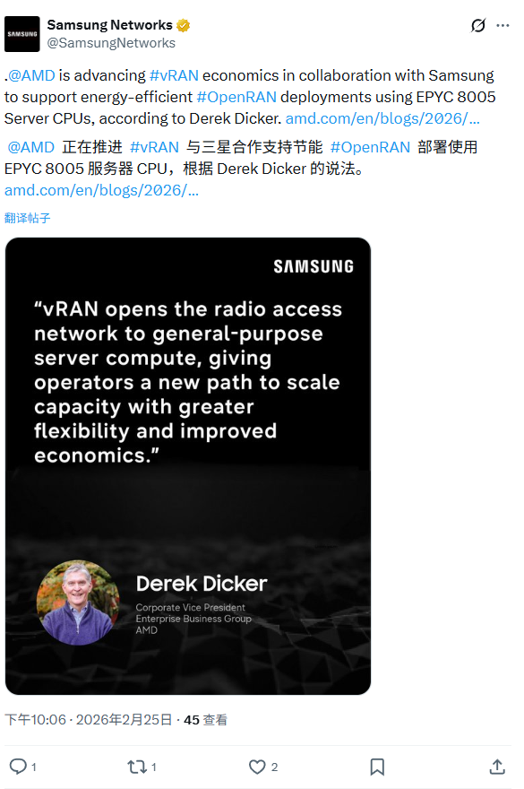 IT之家 2 月 25 日消息,AMD 今日发布公告,宣布推出最新一代面向电信与边缘场景的 EPYC 8005 系列服务器 CPU(代号“Sorano”),规格信息暂未公布,主打在开放式与虚拟化无线接入网(vRAN)规模化部署阶段实现更优的“能耗比”和“性价比”。