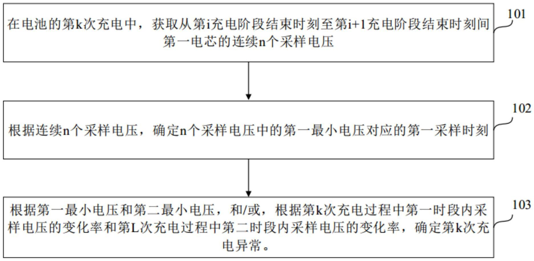 本申请实施例提供一种充电异常的检测方法、装置及存储介质,属于电池充电技术领域。本申请根据第k次充电中第i充电阶段结束时刻至第i+1充电阶段结束时刻间第一电芯的连续n个采样电压,确定n个采样电压中的第一最小电压对应的第一采样时刻。基于上述相同的方式可以确定前k‑1次中任一次充电过程的第二最小电压对应的第二采样时刻。然后根据第一最小电压和第二最小电压,确定第k次充电异常,或者,根据第k次充电过程中第一采样时刻之后的第一时段内采样电压的变化率和前k‑1次中任一次充电过程中第二采样时刻之后的第二时段内采样电压的变化率,确定第k次充电异常,检测充电异常的准确率较高,能有效降低误判率。