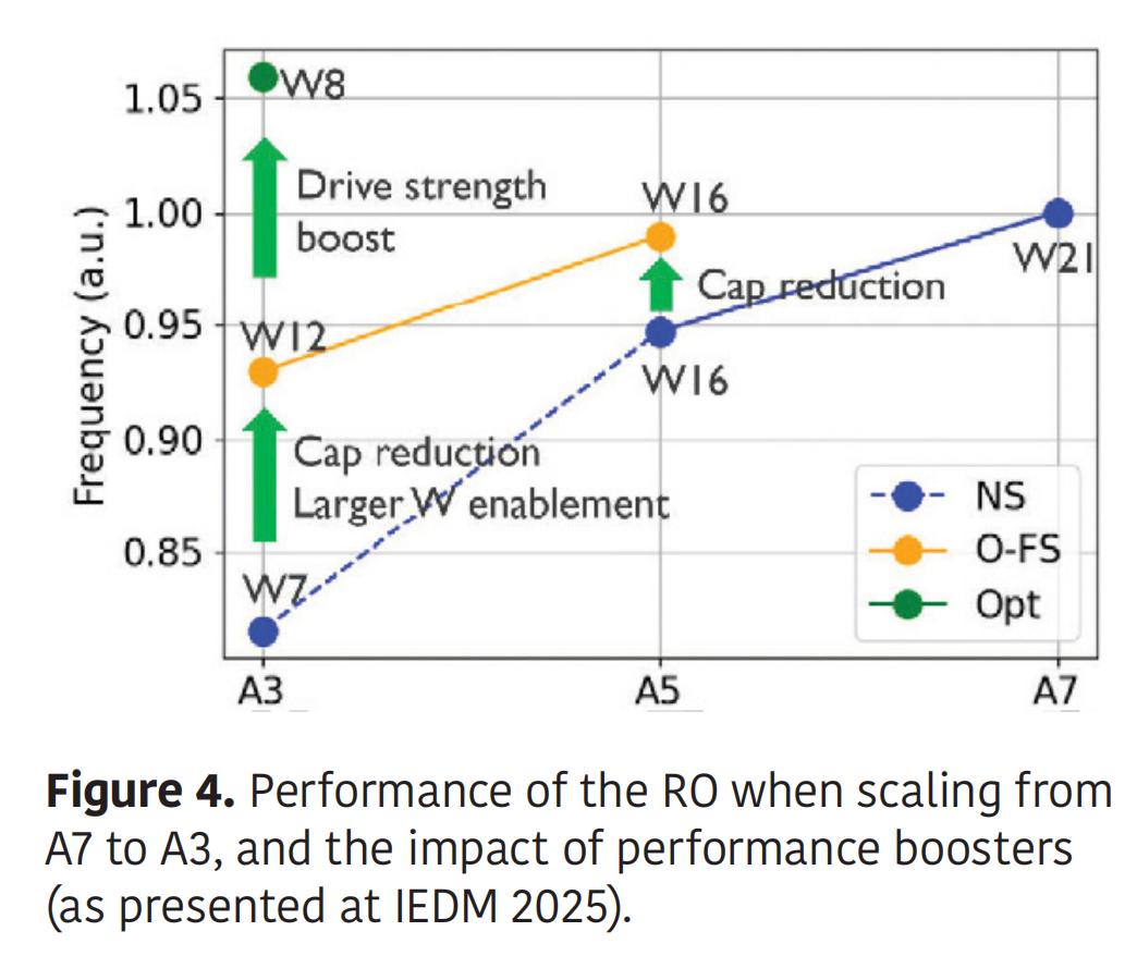 为了支持可扩展性,必须在受限的功率密度预算下,保持各节点上 RO 的每性能。性能评估的关键指标是 RO 的频率,表示为有效驱动电流与有效电容之比。