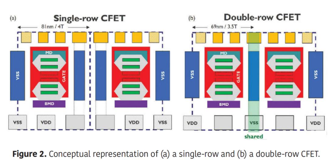在电路层面,imec 提出双排(double-row ) CFET 架构是将 mCFET 集成到 A7 标准单元中的最优方式 。双排 CFET 标准单元包含两排堆叠的器件,中间共享一个垂直信号过孔,单元边界处设有“VSS”功率墙。在 IEDM 2024 上,imec 通过一项设计技术协同优化 (DTCO) 研究,展示了这种双排 CFET 架构如何在 A7 技术节点上实现制造能力和面积效率之间的最佳平衡(图 2)。
