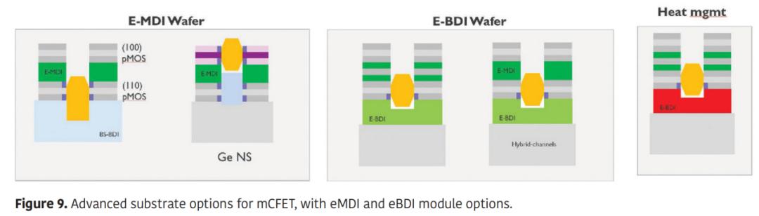 两种方法的主要区别在于初始衬底工程(图 8)。在 eMDI 方案中,mCFET 工艺从预先嵌入 MDI 模块的先进键合衬底开始。在首次键合之前,使用单独的晶圆生长 n 和 pMOS 有源外延层,这使得可以集成异质沟道,从而优化 n 和 pMOS 器件的性能。这些沟道可以是不同取向的(如本研究所示),也可以是具有不同应变的沟道,甚至可以是使用不同材料的 n 和 p 沟道。