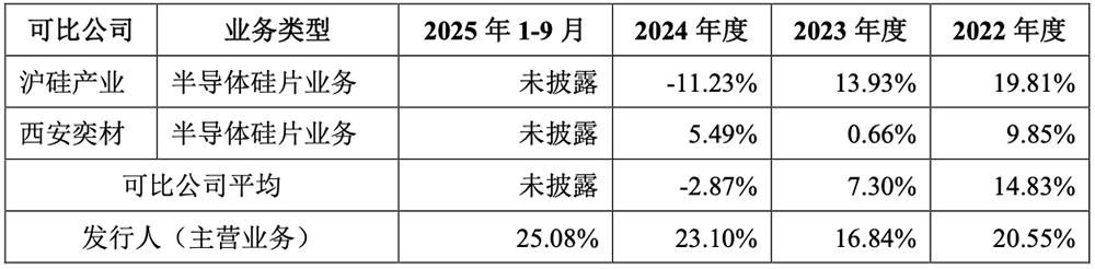 报告期内,其综合毛利率分别为23.81%、15.63%、22.44%、24.56%,主营业务毛利率分别为20.55%、16.84%、23.10%和25.08%,存在一定波动,与沪硅产业、西安奕材对比如下: