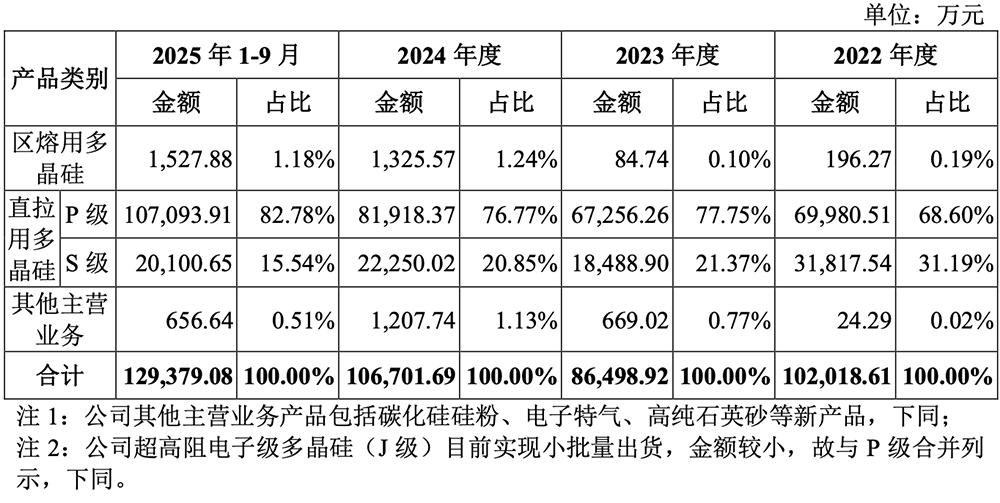 其中,直拉用多晶硅(P级、S级)是主要营收支柱,在2025年1-9月为该公司贡献了82.78%的收入。