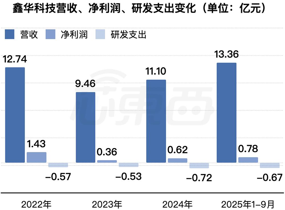 2022年、2023年、2024年、2025年1-9月,鑫华科技营收分别为12.74亿元、9.46亿元、11.10亿元、13.36亿元,净利润分别为1.43亿元、0.36亿元、0.62亿元、0.78亿元,研发费用分别为0.57亿元、0.53亿元、0.72亿元、0.67亿元。