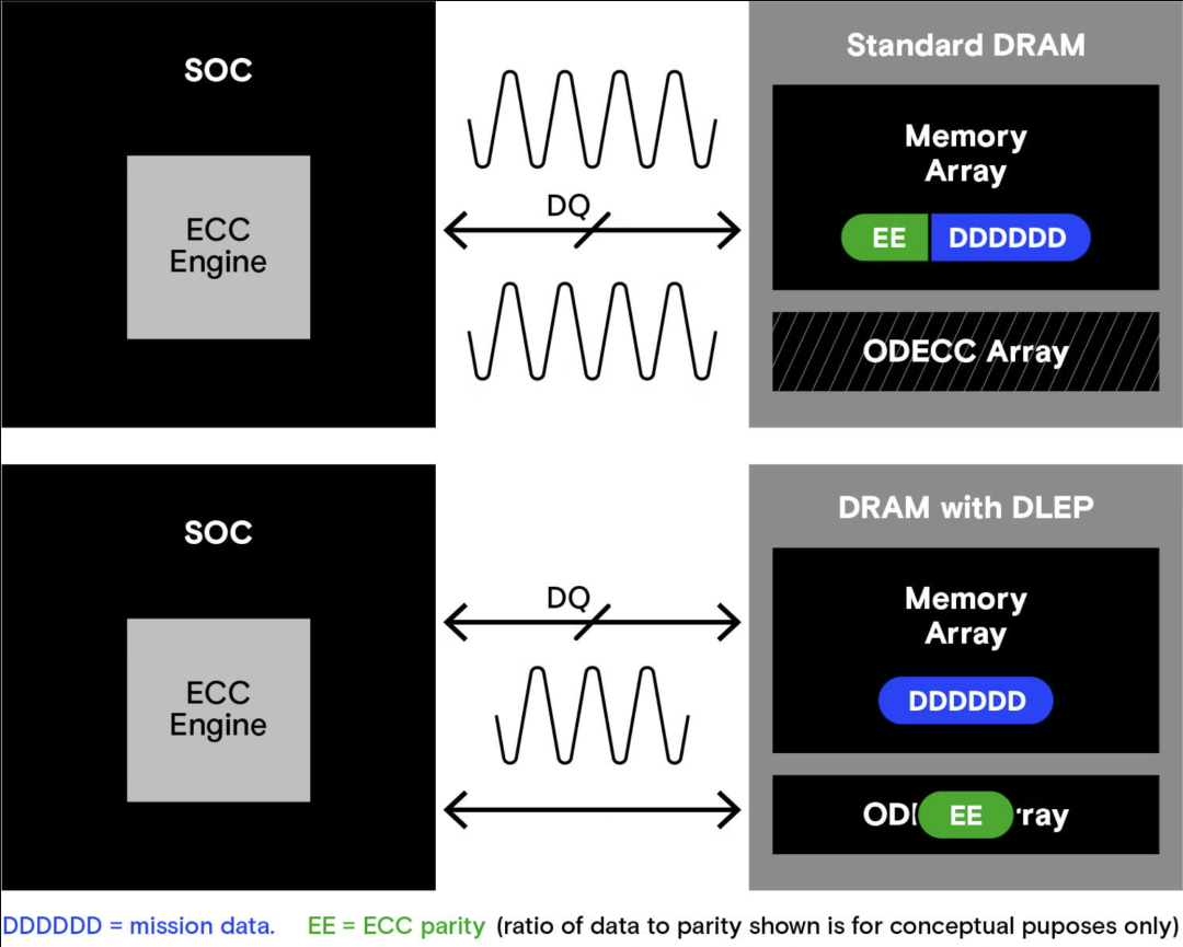 使用标准 DRAM 与使用支持 DLEP 的 DRAM 进行 ECC 数据传输的对比