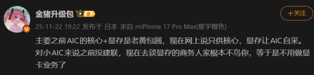 在几个月前就有消息传出,NVDIA决定停止使用原先持续多年的“捆绑销售”模式,即将美光、三星、海力士等显存供应商提供的显存与显卡芯片同时卖出给下游AIC厂商,转而要求AIC厂商自行与RAM厂商沟通定价。这一举动将自身承受的显存价格压力转移到下游厂商中。如果说如华硕、微星、技嘉这样的大AIC还能有谈价格的话语权,那么这对于小AIC来说,去找到足够数量和足够便宜的显存无疑是巨大的挑战。